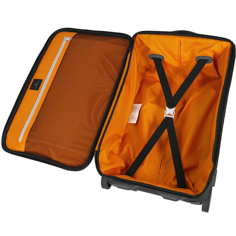 Каркас Викторинокс Трэвэл Вэркс Трэвэлэр имеет прямоугольную, вертикальную форму, которая вмещает два автономных внутренних отделения. Одна из просторных секций чемодана предназначена для хранения и бережной перевозки цифровых устройств – ноутбуков и планшетов. Для этого здесь предусмотрены компактные карманы с плотным слоем мягкого наполнителя, сводящего к минимуму давление, удары и другие негативные механические факторы извне, которые могут повредить электронным устройствам. Во второе отделение чемодана Victorinox можно сложить одежду и другие личные вещи, необходимые в путешествии.