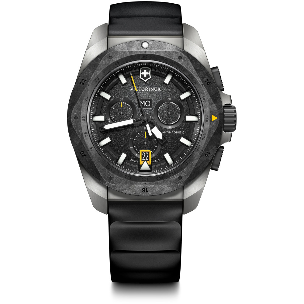 Victorinox I.N.O.X. Chrono – спортивные кварцевые часы с хронографом и тахиметром. Уникальное сочетание титанового корпуса и карбонового безеля швейцарского производства обеспечивает прочность и легкость. Одним словом – техническая и визуальная мощь! Резные формы, строгие геометрические формы, а обновленный фирменный безель выглядит так, как будто он был вырезан острым перочинным ножом. Антимагнитная защита позволяет избежать неточностей времени из-за влияния электромагнитных волн. Сертифицированы по стандарту ISO ударо- и водонепроницаемость.