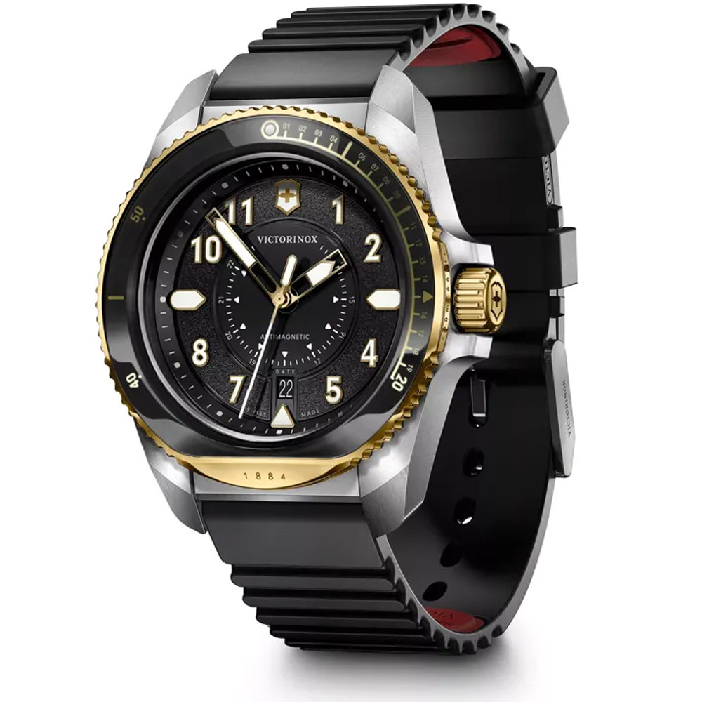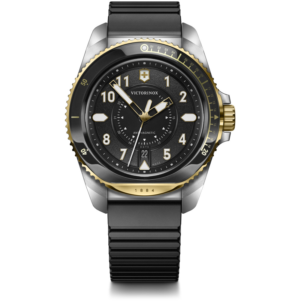 ✔ Ударопрочный корпус 43 мм из нержавеющей стали 316L (гравировка сбоку корпуса). ✔ Черный спортивный ремешок 21 мм из резины (застежка – стальная брендированная пряжка). ✔ Вращающийся в одну сторону безель черного цвета с отделкой золотым PVD. ✔ Сапфировое антибликовое стекло, устойчивое к ударам и царапинам. ✔ Черный циферблат с зернистой текстурой и форматом времени 12/24 часа. ✔ Дата в позиции «6 часов». ✔ Яркая люминесцентная индикация Super-LumiNova® ✔ Форма стрелок напоминает указатели на швейцарских горных тропах, а противовес секундной стрелки имеет форму карманного ножа Victorinox. ✔ Год основания Victorinox – 1884 – выгравирован на безеле часов, напоминая о богатой истории и наследии бренда. ✔ Кварцевый аналоговый механизм - Ronda 715 с функцией EОL, которая предупреждает о необходимости скорого визита к часовщику для замены батареи. ✔ Ударопрочность (ISO 1413). ✔ Антимагнитная защита (ISO 764). ✔ Водонепроницаемость (ISO 22810): до 20 ATM / 200 м / 660 футов. ✔ Герметичная задняя крышка с завинчивающейся фиксацией и защищенная заводная головка. ✔ Большой срок гарантии: 5+ лет (в том числе 1 год гарантии на элементы питания). ✔ Часы поставляются в новой подарочной упаковке.