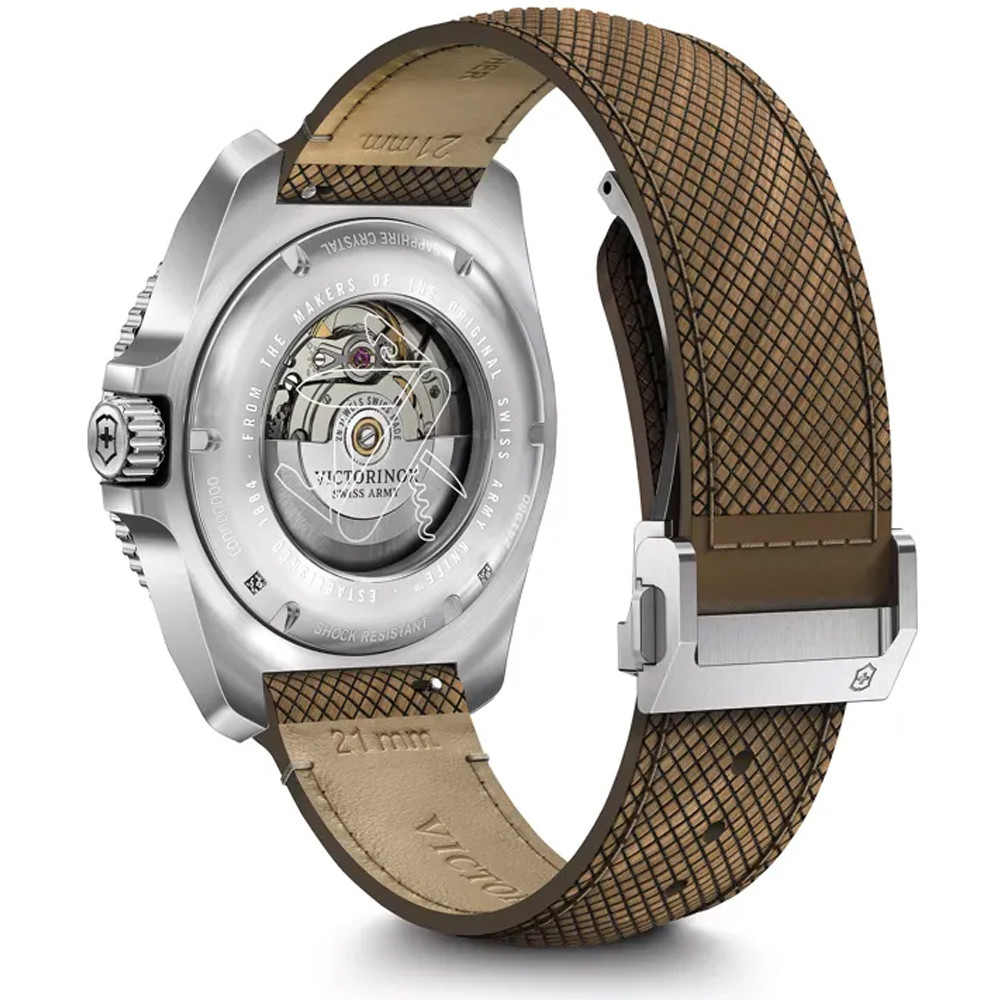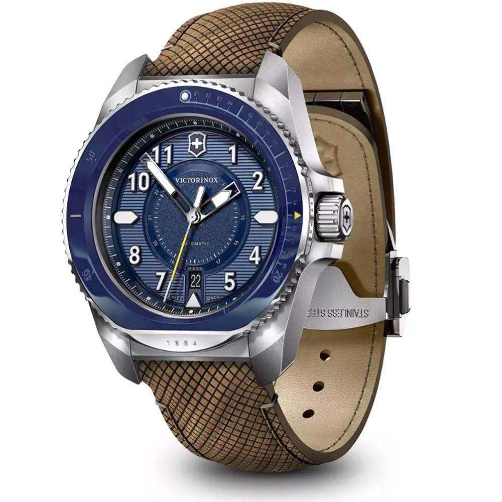 ✔ Ударопрочный корпус 43 мм из нержавеющей стали 316L с прозрачной задней крышкой. ✔ Инновационный деревянный ремешок 21 мм коричневого цвета (стальная раскладывающаяся застежка). ✔ В комплекте дополнительный спортивный ремешок из резины синего цвета (застежка – стальная пряжка). ✔ Чехол для хранения ремешков. ✔ Синий вращающийся безель с керамической вставкой. ✔ Год основания Victorinox – 1884 – выгравирован на скошенной кромке безеля, напоминая о богатой истории и наследии бренда. ✔ Сапфировое антибликовое стекло, устойчивое к ударам и царапинам. ✔ Синий текстурированный циферблат с форматом времени 12/24 часа. ✔ Показывают текущую дату в позиции «6 часов». ✔ Яркая люминесцентная индикация Super-LumiNova® ✔ Форма стрелок напоминает указатели на швейцарских горных тропах, а противовес секундной стрелки имеет форму карманного ножа Victorinox. ✔ Автоматический механизм Selita SW200-1 – запас хода 38 часов. ✔ Ударопрочность (ISO 1413). ✔ Водонепроницаемость (ISO 22810): до 20 ATM / 200 м / 660 футов. ✔ Герметичная задняя крышка с завинчивающейся фиксацией и защищенная заводная головка. ✔ Большой срок гарантии: 5+ лет. ✔ Оригинальная подарочная коробка с аксессуарами.
