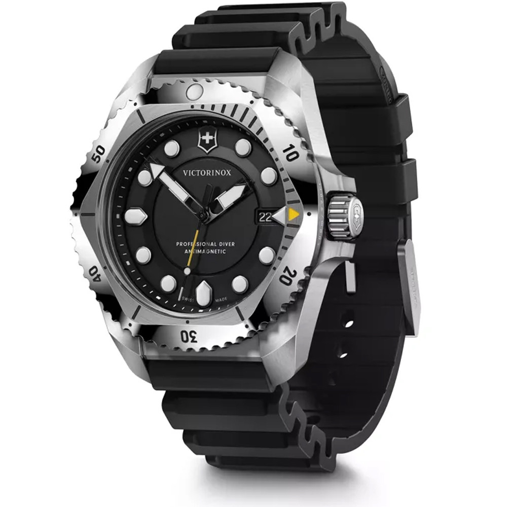 Victorinox DIVE PRO Quartz – водо- и ударопрочные кварцевые часы на черном спортивном ремешке. Профессиональные часы для дайвинга швейцарского производства, сертифицированные по стандарту ISO 6425 и водонепроницаемые до 300 м.