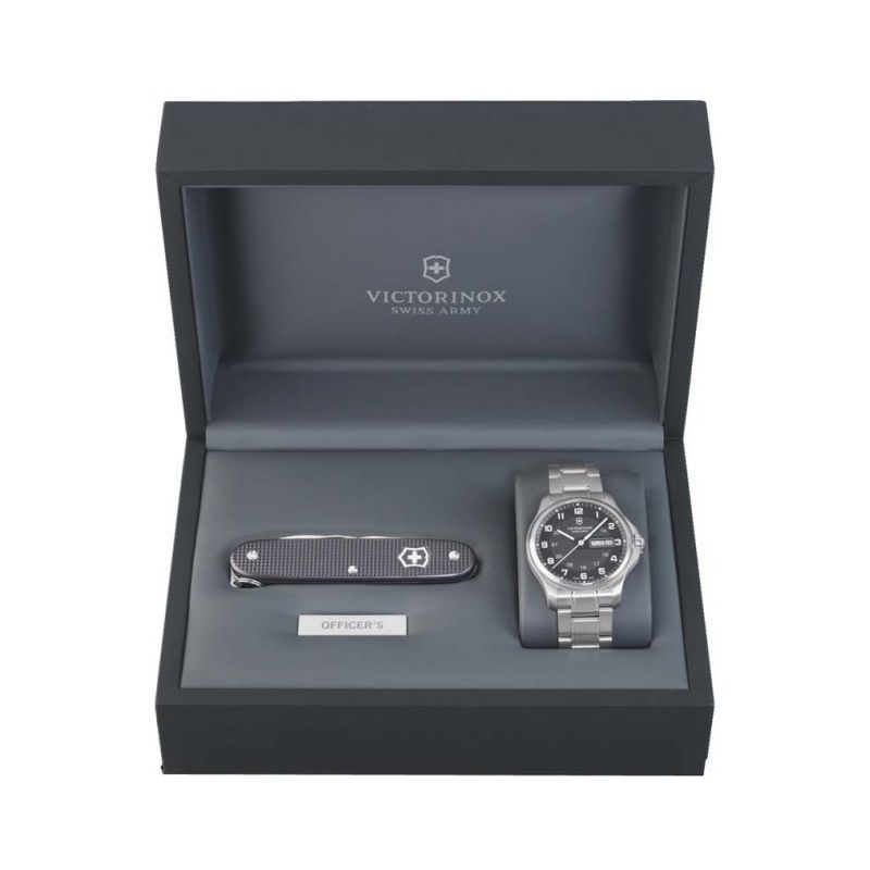 OFFICER'S Day Date мужская модель / кварц / темно-серый циферблат / стальной браслет / 100м / Сапфировое антибликовое стекло / Стальной корпус-40мм 241590.1 Швейцария + нож Alox Pioneer Калибр механизма Ronda 517