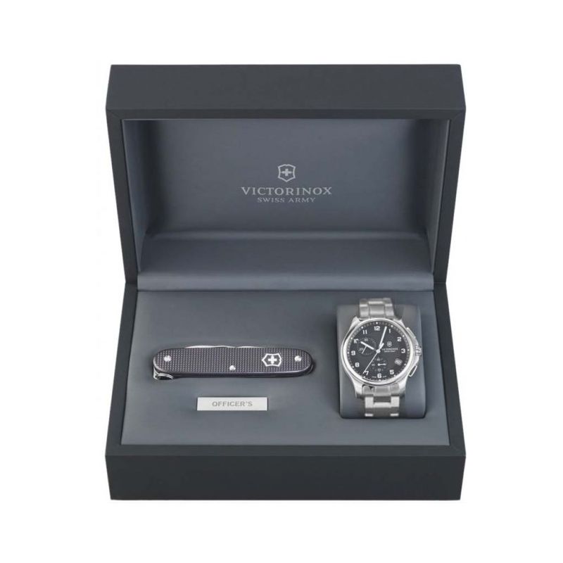 Набор: OFFICER'S Chrono мужская модель / кварц / хронограф / темно-серый циферблат / стальной браслет / 100м / SA / ST / 42мм + нож Alox Pioneer 241592.1 Швейцария Калибр механизма ETA G10.211
