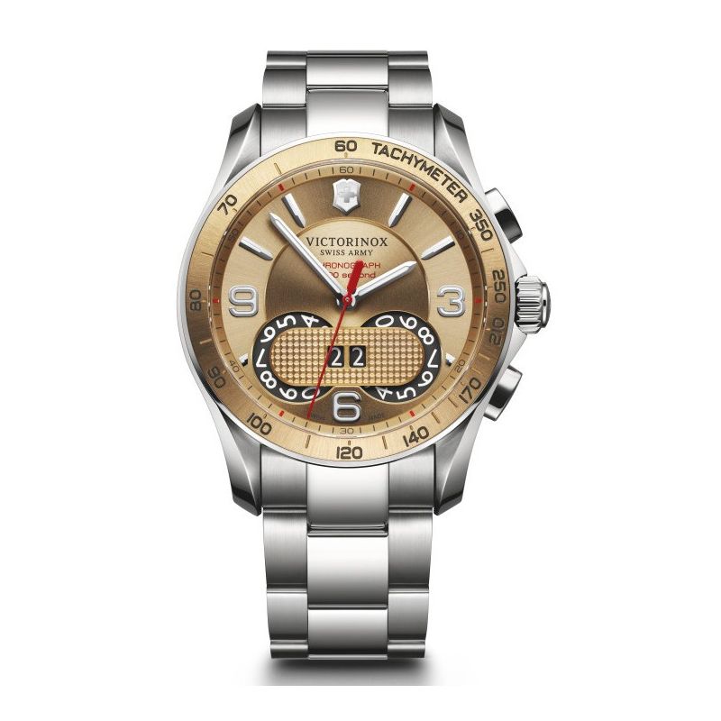 Золотистый циферблат украшен гильошированной декоративной деталью, отсылающей нас к легендарному Swiss Army Officer’s Knife. Дополнен серебристой индикацией (часовая и минутная стрелки, крупные арабские цифры (3, 6 и 9) и метки времени), а также стильным акцентом в виде красной секундной стрелки корпоративного цвета Victorinox. Ободок также имеет функциональное значение, разместив 60-минутные маркеры. В верхней части циферблата - эмблема компании Викторинокс. На минутной и часовой стрелках, а также метках/цифрах – люминесцентные вставки Super-Luminova®. Тахиметрическая шкала (тахиметр) на фиксированном золотистом безеле, выполненном в одной цветовой гамме с циферблатом. Твердое и устойчивое к царапинам стекло из сапфирового кристалла (Sapphire Crystal). Антибликовое покрытие позаботиться о четкой читаемости времени без оптических искажений даже при ярком свете. К тому же подарит благородный голубой перелив.