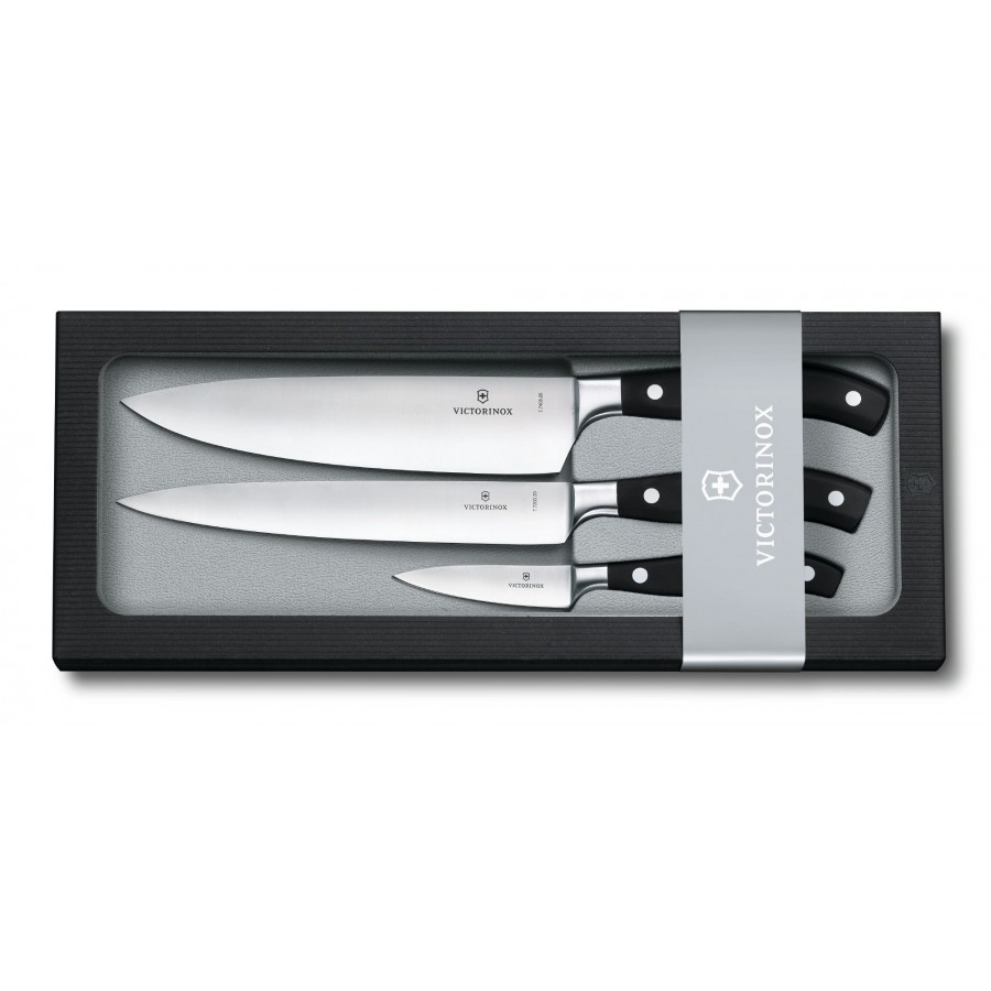 Набор кованых кухонных ножей Сhef's Grand Maitre 3 ножа с лезвием 8 см, 20 см и 20 см (гладкое) с черной ручкой Victorinox 7.7243.3 Швейцария