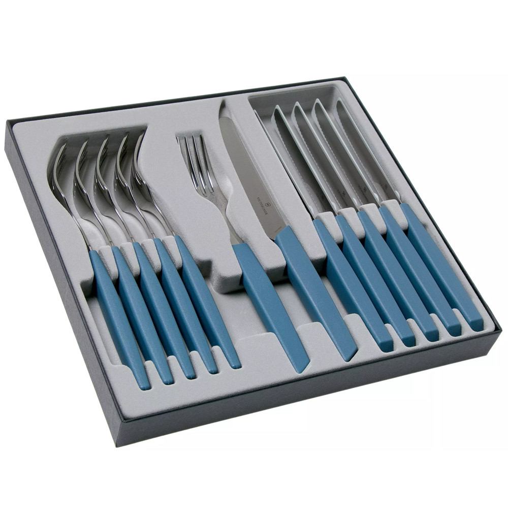Victorinox SWISS MODERN Table Set (12 предметов) – швейцарский набор столовых приборов, состоящий из 6 ножей и 6 вилок с синими ручками.
