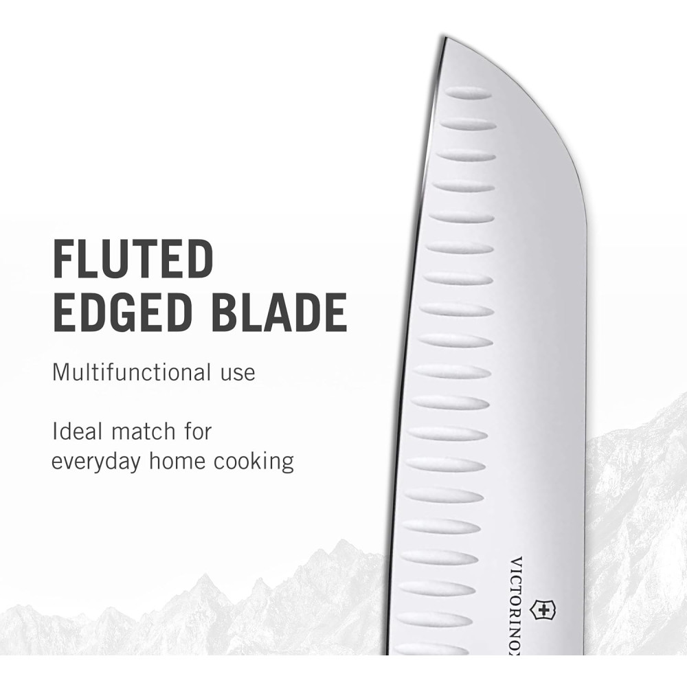 ✔ Victorinox Wood Santoku оснащен широким лезвием с рифленым краем и длиной клинка 17 см. При нарезке эти выемки минимизирует прилипание продуктов к лезвию, что позволяет нарезать продукт еще более тонко и ровно. Лезвие с симметричной двусторонней заточкой режущей кромки будет одинаково удобно как для левшей, так и правшей. Этот «японец» - универсальный вариант для различных режущих и рубящих процессов на кухне. Специальная форма клинка Santoku создана для красивой и комфортной нарезки и рубки ломтиками или кубиками как мяса, так и овощей.