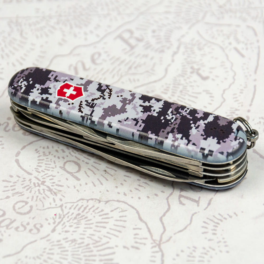 Victorinox HUNTSMAN ARMY Пиксель синий с красн. Лого - многозадачный складной нож 91 мм на 15 функций с матовыми пиксельными накладками серо-синего цвета с красным печатным логотипом Victorinox. Прекрасный вариант высококлассного презента военным и всем поклонникам швейцарских армейских ножей. Идеальный набор инструментов для туриста, охотника, любителя походов, всех искателей приключений, которые любят сходить с тропы. Перепилить небольшое бревно или доску, отрезать, открыть банку, открутить или закрутить, привести в порядок ногти, обрезать лишние нитки на одежде – с Victorinox Huntsman легко подготовиться к ежедневным вызовам.