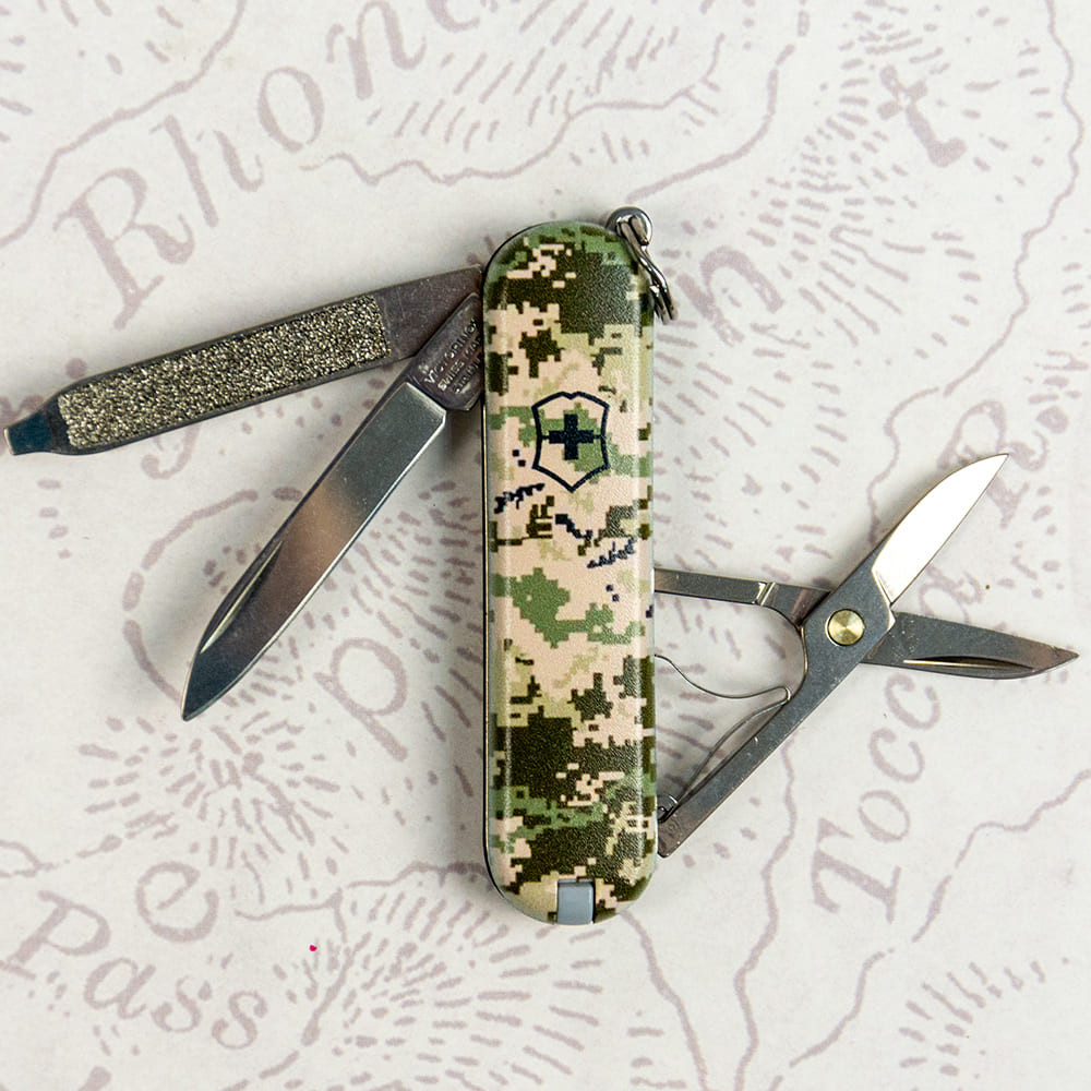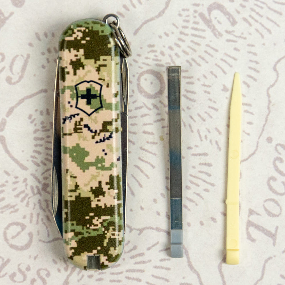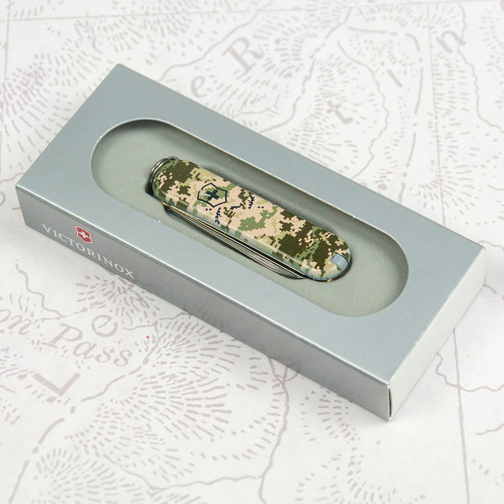 Victorinox CLASSIC SD ARMY Пиксель с Лого - крошечный складной нож-брелок 58 мм на 7 функций с матовыми пиксельными накладками. Многофункциональный, невероятно компактный и украинский дизайн с пикселем - все в этом ноже делает его знаковым дополнением в вашу коллекцию карманных ножей Викторинокс. Удобно носить его всегда с собой на связке ключей, в сумке или кармане. Культовый дизайн и выверенная годами практичность с популярными и востребованными каждый день функциями. Отрезать, нарезать, подкрутить винт или привести в порядок ногти - это только маленькая часть того, что вы сможете делать с вашим новым помощником. Прекрасный вариант высококлассного презента военным и всем поклонникам швейцарских армейских ножей.