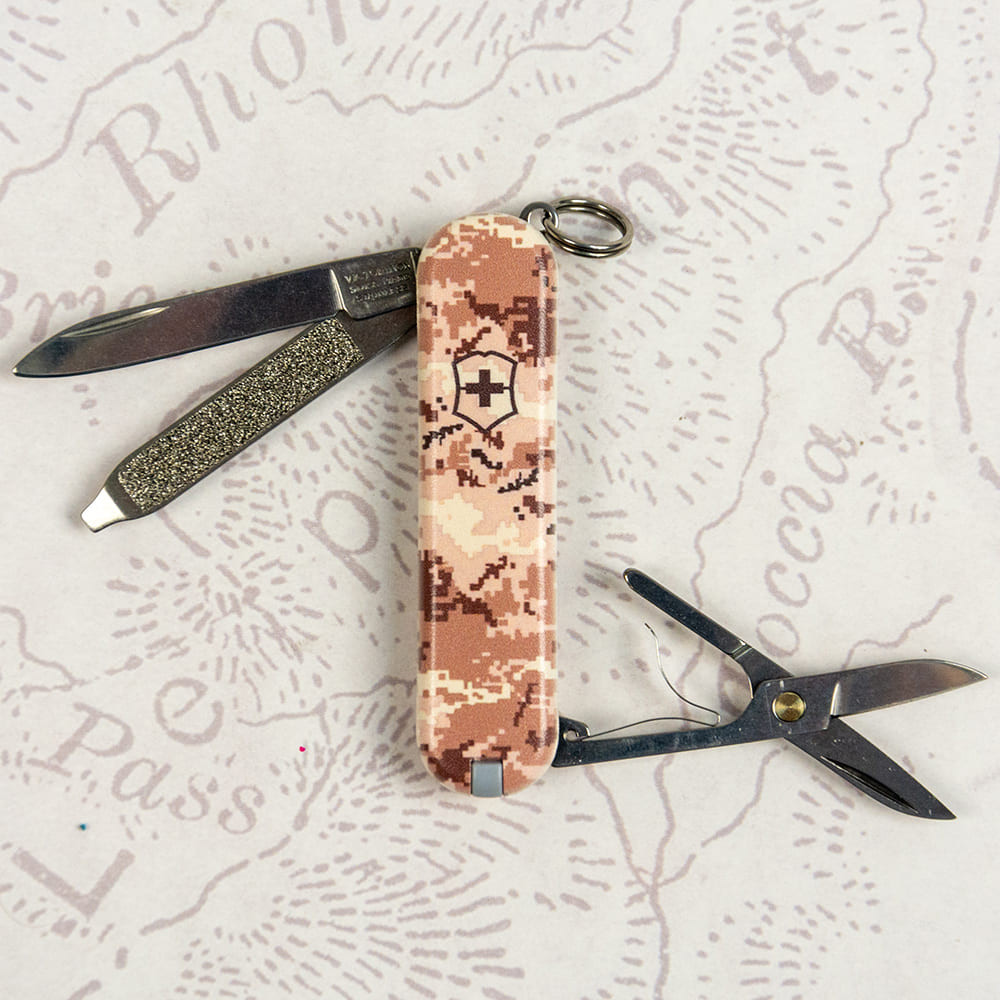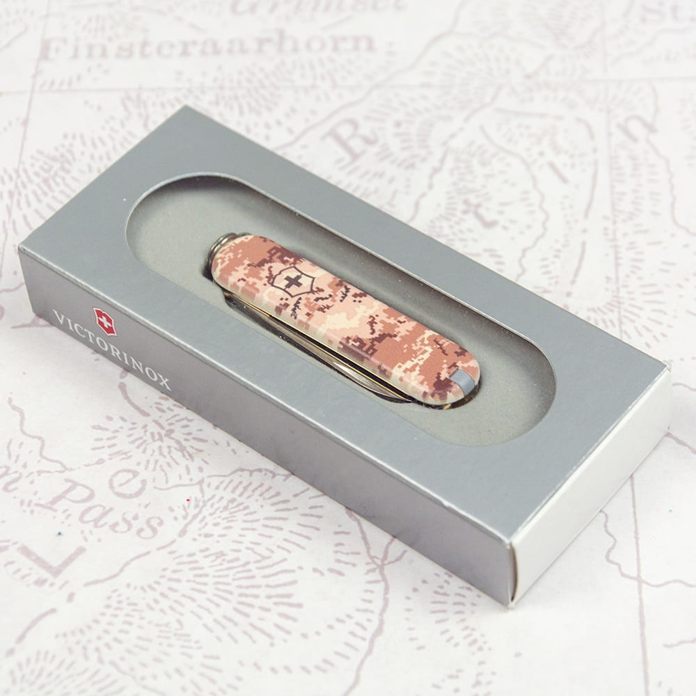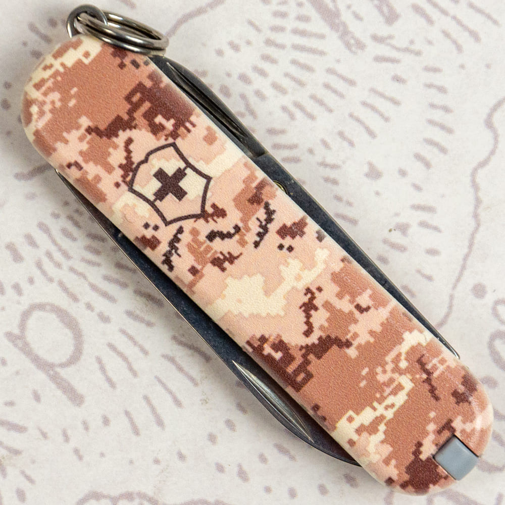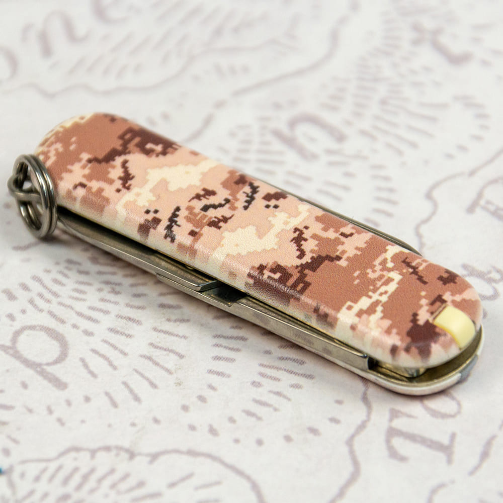 Victorinox CLASSIC SD ARMY Пиксель песочный с Лого - крошечный складной нож-брелок 58 мм на 7 функций с матовыми накладками в расцветке песочно-бежевого пикселя. Многофункциональный, невероятно компактный и украинский дизайн с пикселем - все в этом ноже делает его знаковым дополнением в вашу коллекцию карманных ножей Викторинокс. Удобно носить его всегда с собой на связке ключей, в сумке или кармане. Культовый дизайн и выверенная годами практичность с популярными и востребованными каждый день функциями. Отрезать, нарезать, подкрутить винт или привести в порядок ногти - это только маленькая часть того, что вы сможете делать с вашим новым помощником. Прекрасный вариант высококлассного презента военным и всем поклонникам швейцарских армейских ножей.