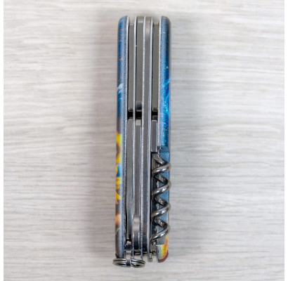 Многофункциональный нож HUNTSMAN UKRAINE [Звездная бабочка] с качественной цветной печатью на обеих накладках и комбинированным матово-глянцевым лаковым покрытием. Профессиональное исполнение эксклюзивного дизайна. Специальное эстетичное предложение для украинских поклонников и коллекционеров бренда Victorinox.