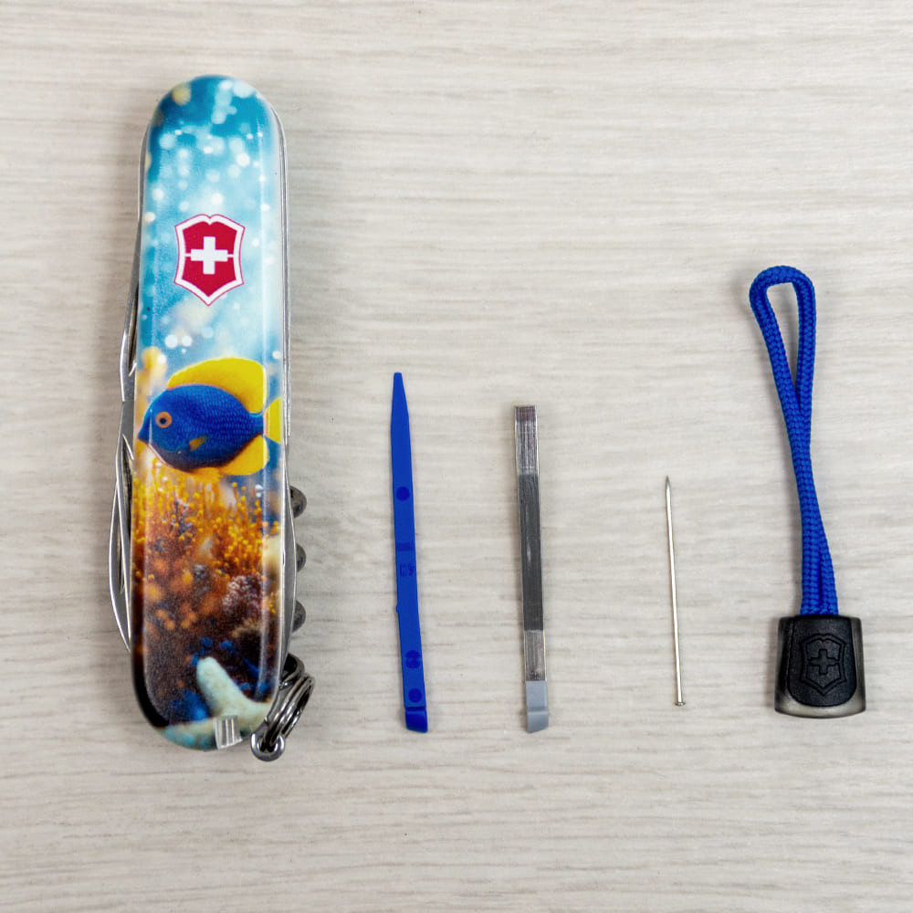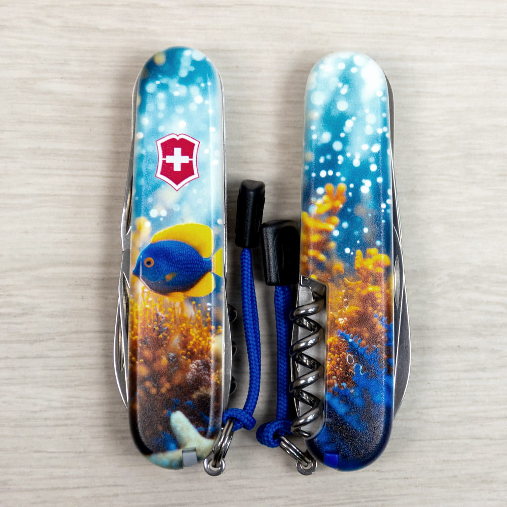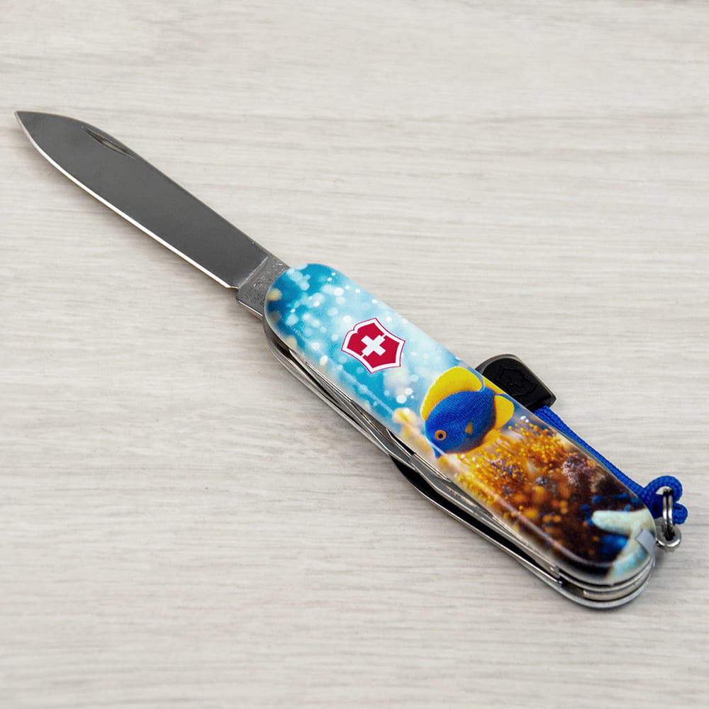 Оригинальный швейцарский складной нож CAMPER DESIGN [Желто-голубая рыбка] с цветной печатью на обеих накладках и комбинированным матово-глянцевым покрытием. Специальное эстетичное предложение для украинских поклонников и коллекционеров бренда Victorinox. Идеальный вариант интересного подарка в красивой упаковке с прозрачным окошком, что позволяет видеть дизайн сразу и подчеркивает эксклюзивность подарка.
