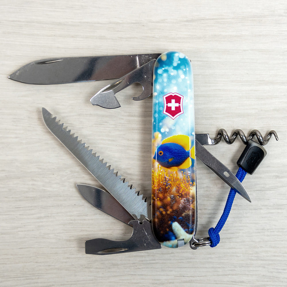 Эксклюзивный складной нож Victorinox CAMPER DESIGN 91мм/14 функций /штопор/пила /Желто-голубая рыбка (Швейцария) Гарантия: пожизненная