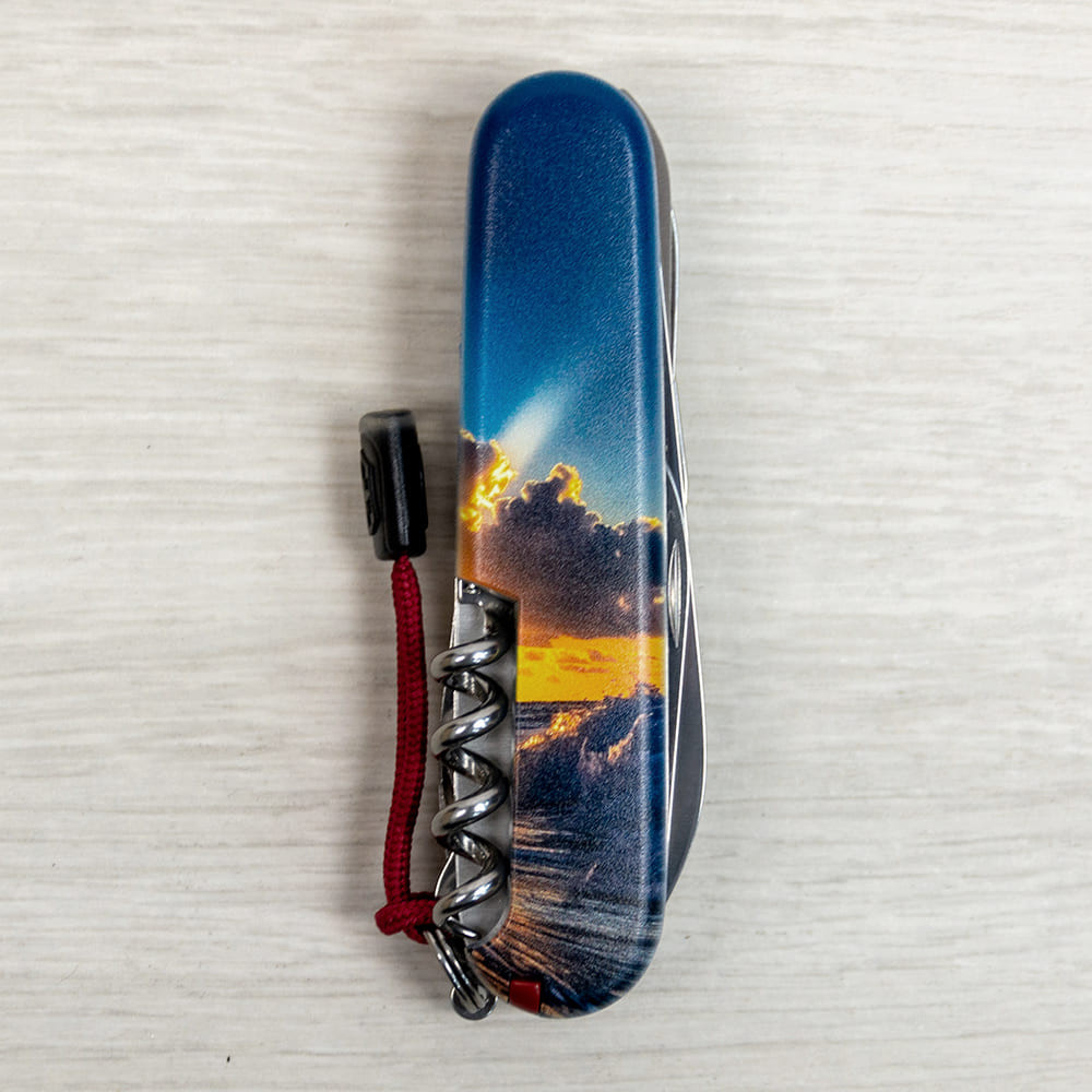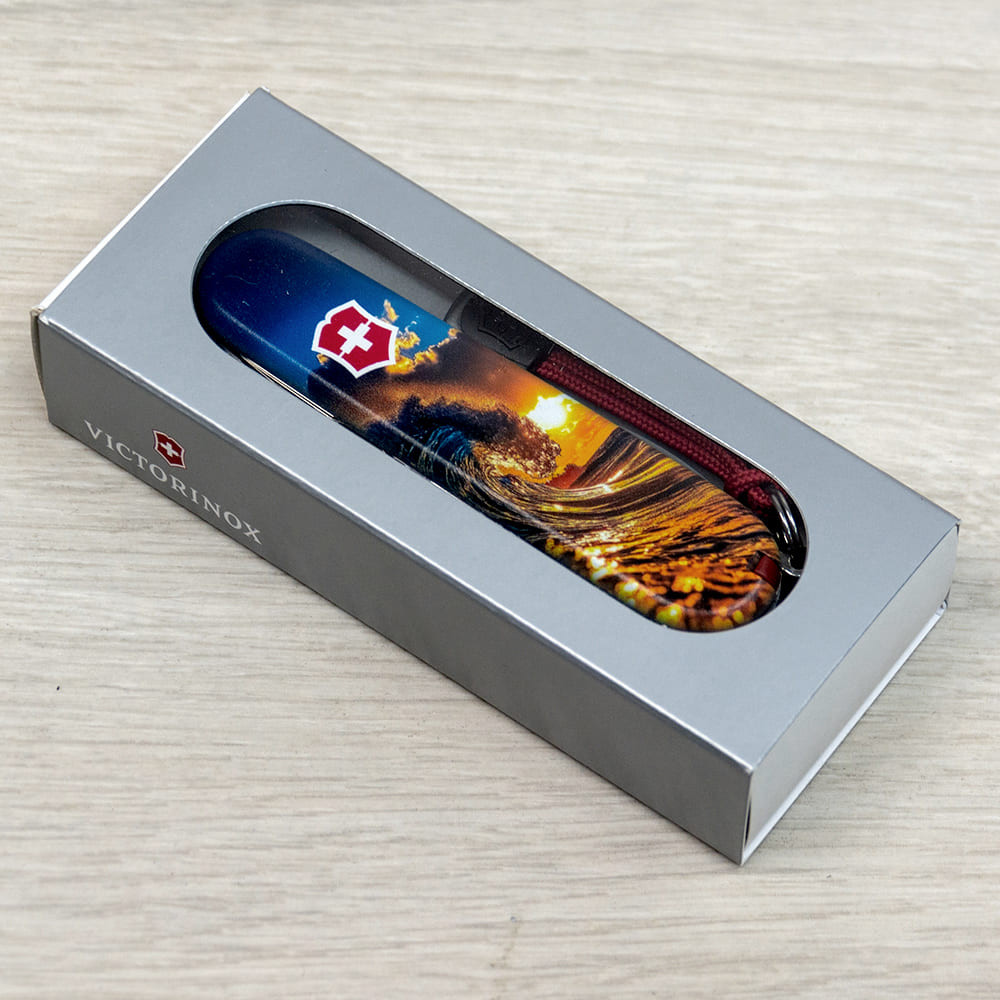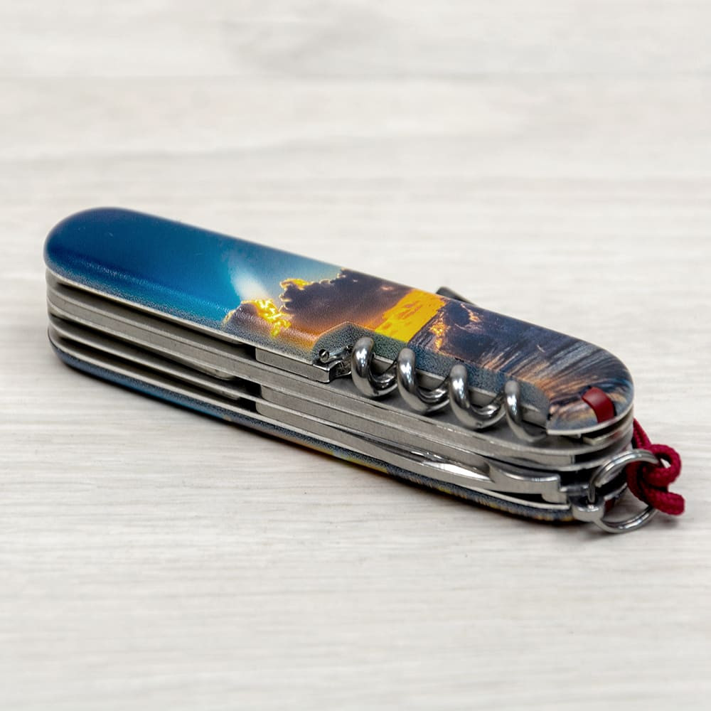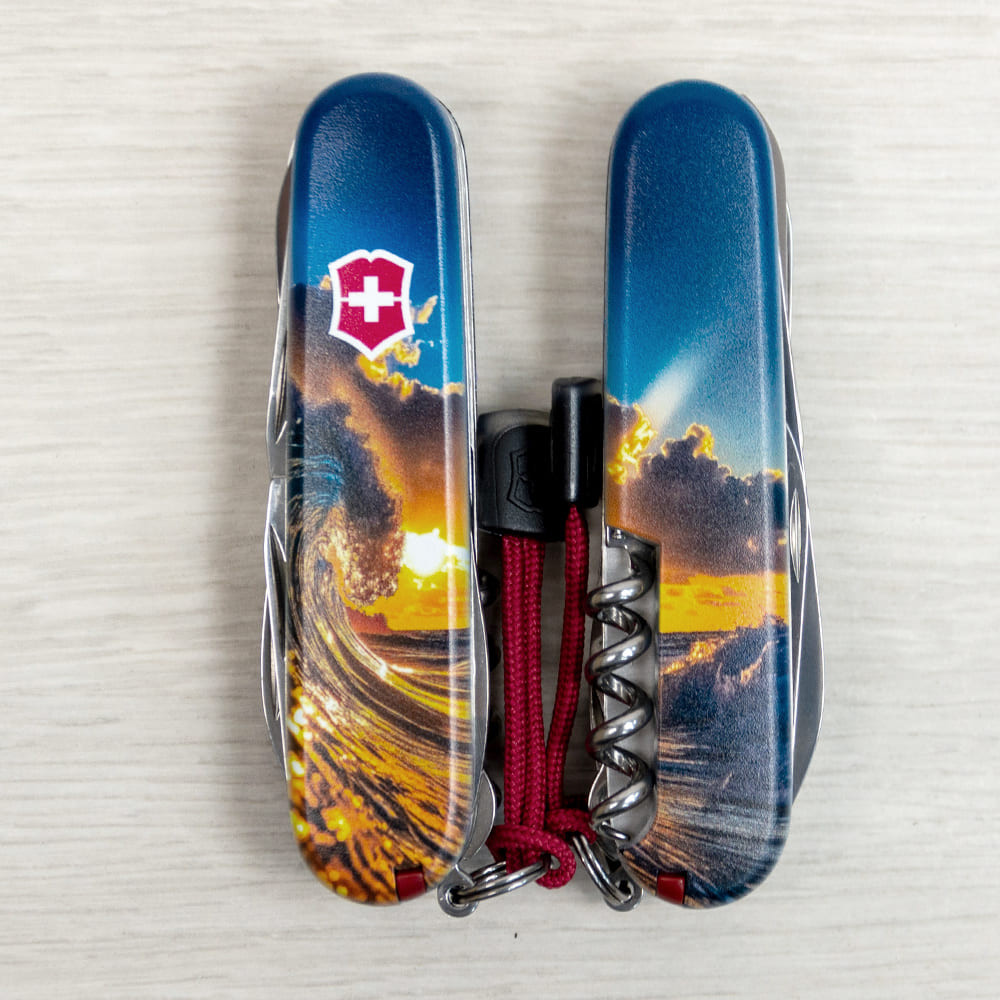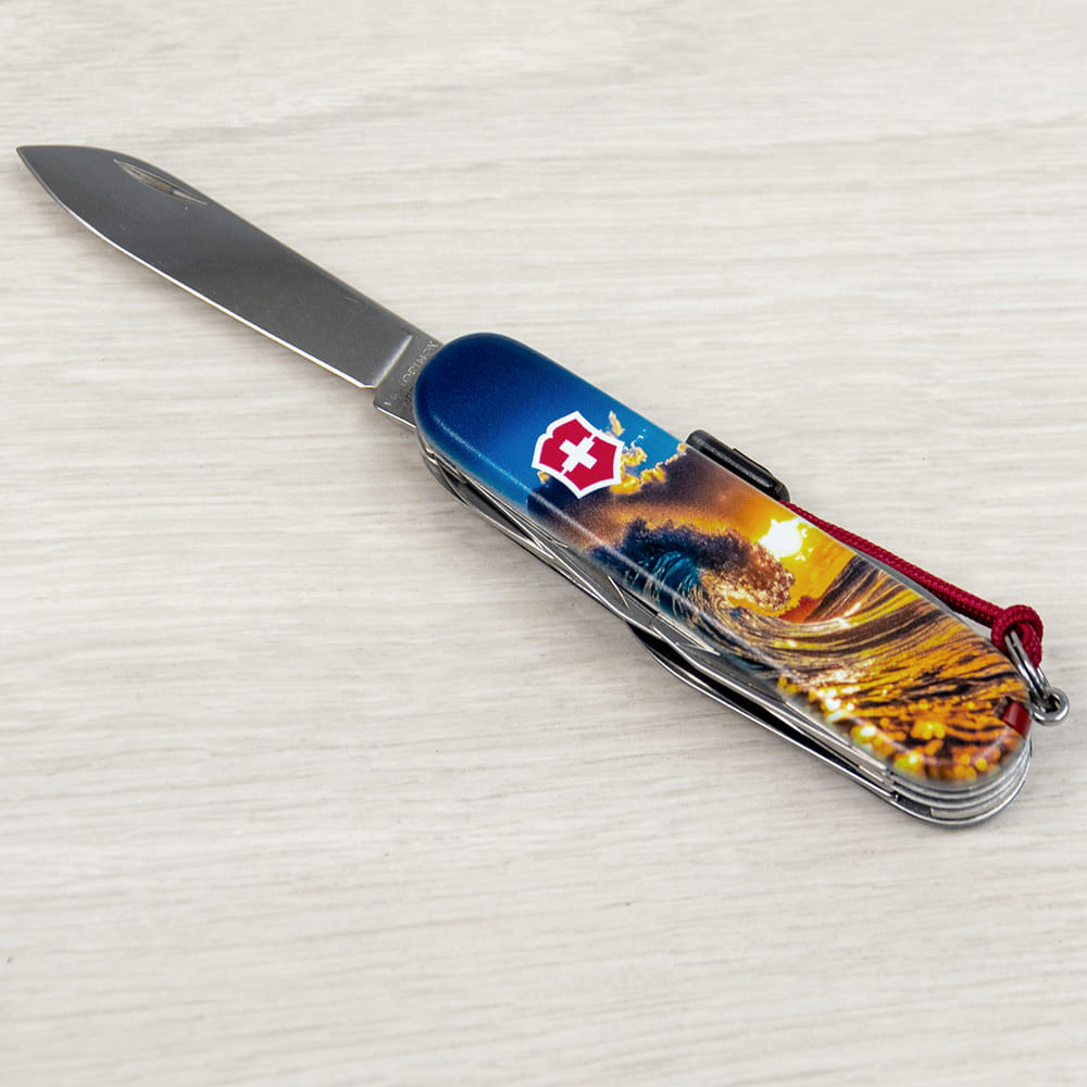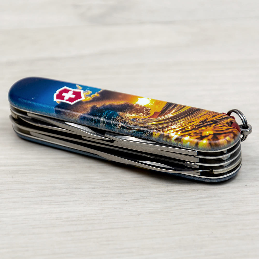 Оригинальный швейцарский складной нож HUNTSMAN DESIGN [Солнечная волна] с цветной печатью на обеих накладках и матовым покрытием. Специальное эстетичное предложение для украинских поклонников и коллекционеров бренда Victorinox. Идеальный вариант интересного подарка в красивой упаковке с прозрачным окошком, что позволяет видеть дизайн сразу и подчеркивает эксклюзивность подарка.
