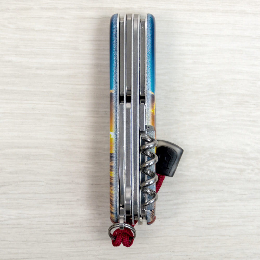 1. основное лезвие 6 см 2. дополнительное лезвие 3,5 см 3-5. открывалка, комбинированная с отверткой 6 мм и пазом для изоляции 6-7. консервный нож с отверткой 3 мм 8. пила по дереву 9. ножницы с пружинным механизмом 10. штопор 11. шило с функцией кернера или дырокола 12. пинцет в передней накладке 13. зубочистка в задней накладке 14. стальной крючок 15. кольцо для крепления 16. стальная булавка 17. темляк Victorinox