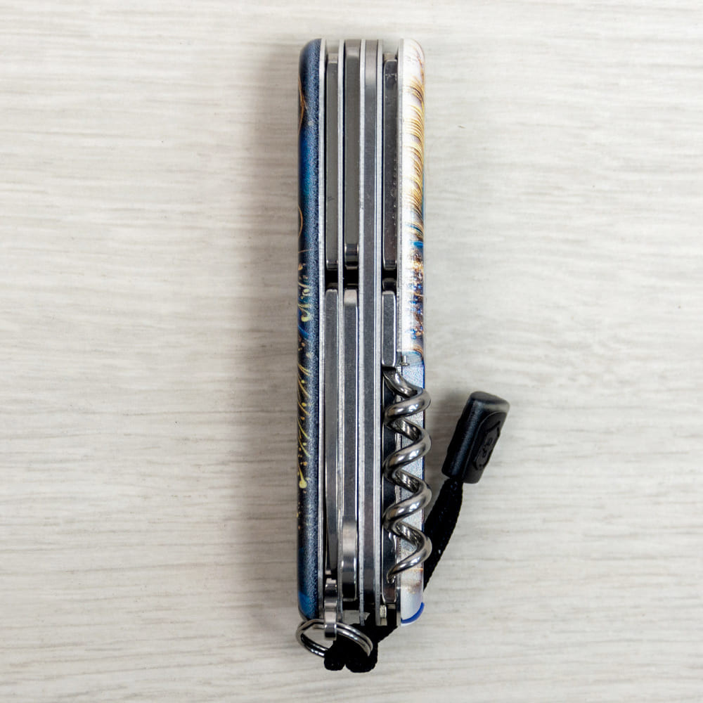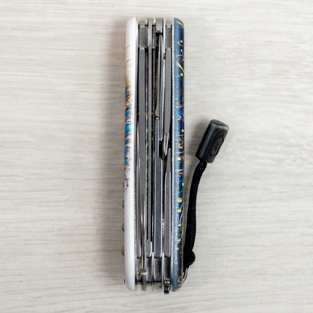- Функции: Кольцо для ключей, Пинцет, Зубочистка, Ножницы, Штопор, Малое лезвие, Булавка, Крючок многоцелевой, Пила по дереву, Большое лезвие, Шило - кернер, Открывалка для бутылок, Малая плоская отвертка, Консервный нож, Большая плоская отвертка, Паз для снятия изоляции