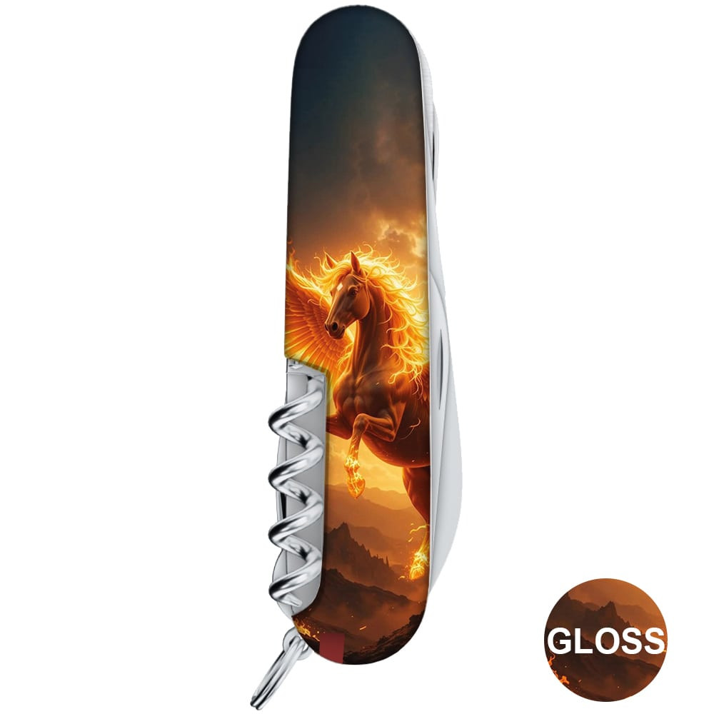 Складной нож HUNTSMAN ZODIAC 2026 [Огненный пегас], посвященный году Лошади. Карманная многофункциональная модель HUNTSMAN 91 мм с основными 15 функциями в праздничном выпуске дополнена булавкой и фирменным темляком Victorinox. Незаменимый набор инструментов, чтобы подготовиться к ежедневным вызовам, туристическим походам и отдыху на свежем воздухе.