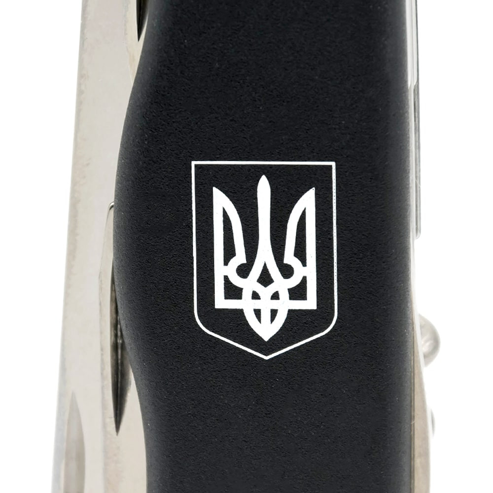 Для оформления рукояти был выбран насыщенный черный фон, украшением которого послужили, нанесенные методом высококачественной печати герб Украины и фирменная символика Викторинокс. Толстый слой укрепляющего лака подчеркивает глубину и насыщенность цветов, а также надежно защищает оформление от износа и утери первоначальной целостности.