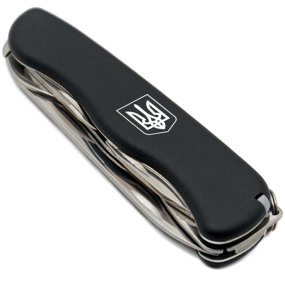 Большой карманный нож NOMAD UKRAINE с фиксатором лезвия Liner Lock / 111мм / 11 функций / черные накладки из полиамида + белый Герб / штопор Victorinox Швейцария