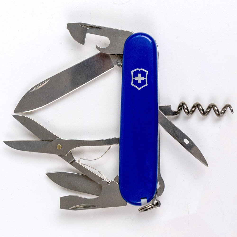 Victorinox CLIMBER (синий) – средний карманный нож 91 мм на 14 функций. Climber - швейцарский армейский нож с солидным функционалом для выполнения большого спектра работ. Содержит два очень острых лезвия разной длины, удобные ножницы как для быстрого маникюра, так и обрезки ниток. Открывалки (для бутылок и консервов) дополнены плоскими отвертками на конце. Многозадачный крючок, штопор и шило. В накладках вы найдете не менее полезный набор приспособлений, а стальное кольцо позволит прикрепить нож к цепочке или темляку. Все инструменты гарантируют безупречную работу и не люфлят.