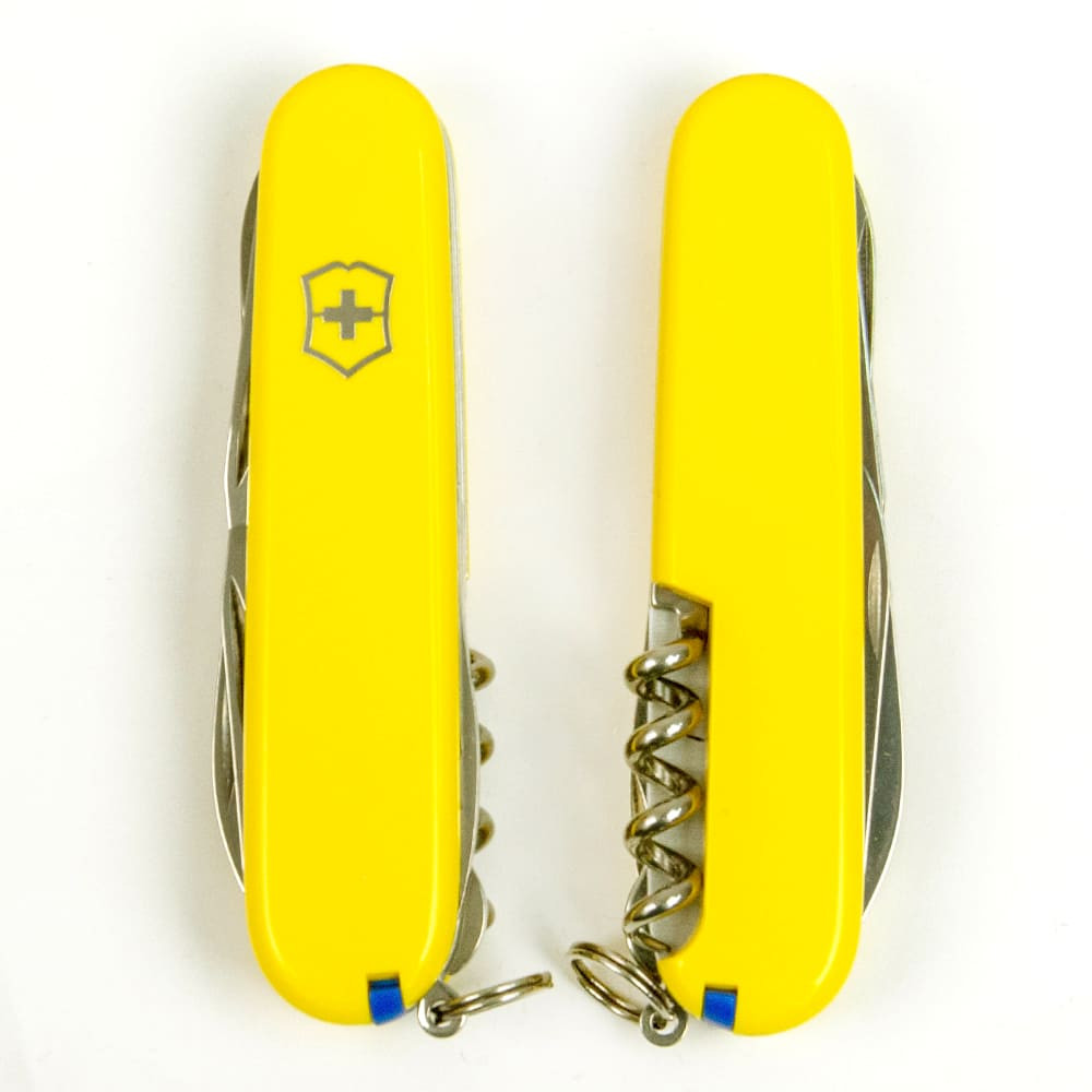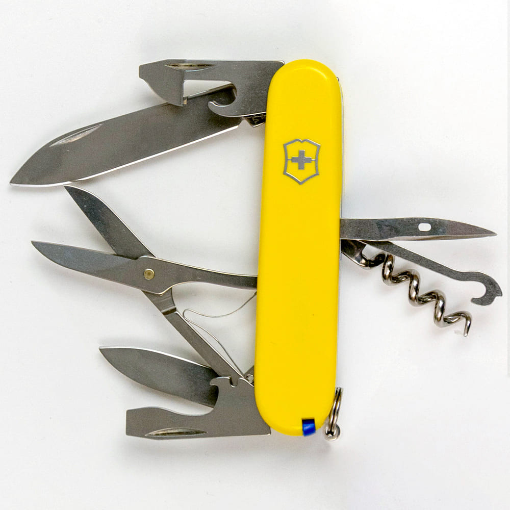 Victorinox CLIMBER (желтый) – средний карманный нож 91 мм на 14 функций. Climber - швейцарский армейский нож с солидным функционалом для выполнения большого спектра работ. Содержит два очень острых лезвия разной длины, удобные ножницы как для быстрого маникюра, так и обрезки ниток. Открывалки (для бутылок и консервов) дополнены плоскими отвертками на конце. Многозадачный крючок, штопор и шило. В накладках вы найдете не менее полезный набор приспособлений, а стальное кольцо позволит прикрепить нож к цепочке или темляку. Все инструменты гарантируют безупречную работу и не люфлят.