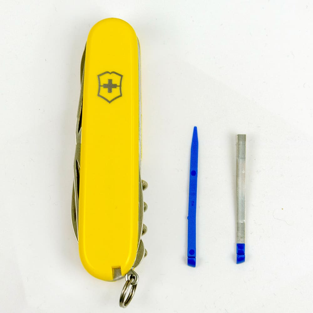 Обратите внимание, что все ножи Victorinox 91 мм с пластиковыми накладками имеют специальное отверстие под булавку в накладке возле штопоре (в комплектацию к данной модели булавка не входит и продается отдельно).