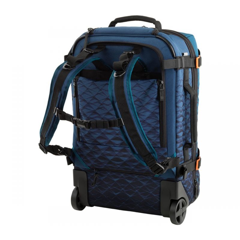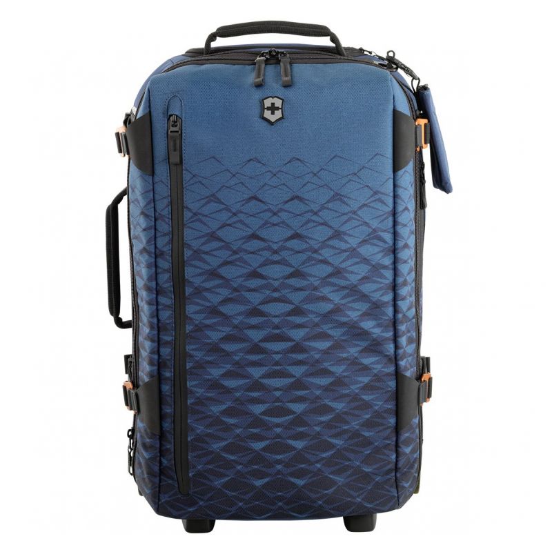 Валіза-рюкзак на колесах Victorinox Travel Vx Touring/Dark Teal 604323 - чудовий багажний аксесуар від всесвітньо відомого швейцарського бренда Вікторінокс. З першого погляду модель привертає увагу неймовірним дизайном. Прямокутний, вертикальної форми рюкзак виготовлений з поліестеру з рельєфною поверхнею.Ще більшої унікальності цей матеріал набуває в результаті особливого оформлення, виготовленого відповідно до останніх модних тенденцій. У ролі такого виступає ефектне омбре з плавним переходом від густого синього кольору до насиченого відтінку морської хвилі.Наскільки привабливий рюкзак на колесах Вікторінокс Тревел зовні, настільки ж він функціональний і практичний. Список експлуатаційних переваг цього виробу слід почати зі значного об’єму, який становить 40-43 літри.Завдяки таким параметрам, в рюкзак завжди помістяться всі речі, необхідні в далекій подорожі. Основний корисний простір рюкзака представлений просторим внутрішнім відділенням, оснащеним міцними ременями-фіксаторами. Надійне закріплення поклажі стане гарантією того, що речі не помнуться в дорозі.Також у внутрішньому відділенні є текстильна кишеня, що застібається на блискавку. Її можна використовувати для зберігання білизни або будь-яких інших делікатних предметів гардероба. Предмети першої потреби та документи складаються у врізну зовнішню кишеню на замку, побачити яку можна на лицьовій панелі рюкзака.Великий об'єм рюкзака Вікторінокс Тревел дозволяє скласти в нього велику кількість речей. В результаті багажний атрибут може стати досить важким. Щоб під час перенесення на спині рівномірно розподілити вагу і тиск поклажі, задня панель рюкзака оснащена ортопедичною системою.Використання Victorinox Travel Vx Touring відбувається за допомогою пари ергономічних наплічних лямок, довжина яких легко адаптується під ріст власника за допомогою спеціальних ременів з фіксаторами. Для ручної експлуатації виробу в горизонтальному або вертикальному положенні застосовуються міцні, дуже зручні петлі, якими корпус рюкзака оснащується у верхній і бічній частині.Деякими функціональними елементами своєї конструкції рюкзак нагадує класичну дорожню валізу або бізнес-кейс.Такими елементами є двоколісна система і висувна, регульована кнопкою ручка, яка компактно складається у спеціальну кишеньку на замку, розташовану у верхній частині корпусу.