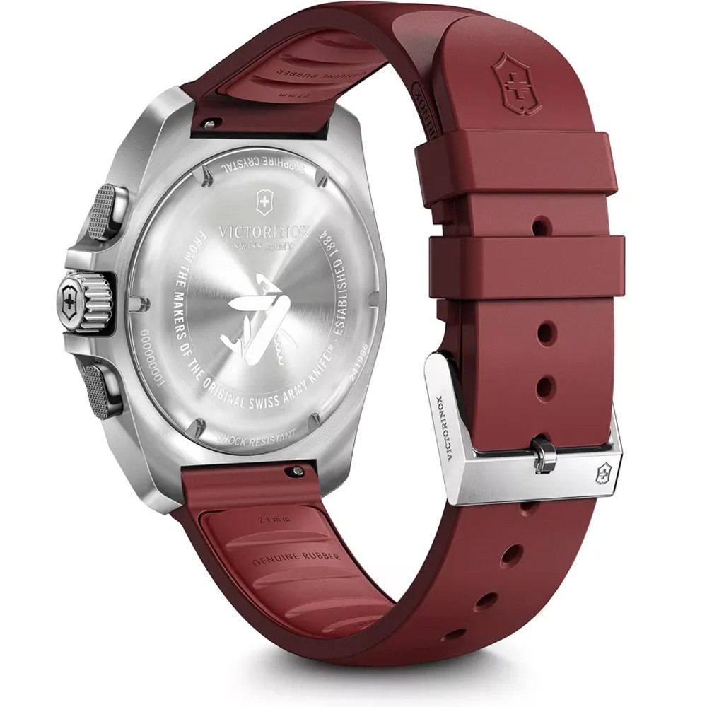 Victorinox I.N.O.X. Chrono - чоловічий кварцовий годинник з хронографом і тахіметром на червоному спортивному ремінці. Одним словом – міць! Різьблені форми, строгі геометричні форми, а оновлений фірмовий безель виглядає так, ніби він був вирізаний гострим складаним ножем. Антимагнітний захист дозволяє уникнути неточності часу через вплив електромагнітних хвиль. Сертифіковані за стандартом ISO ударо- та водонепроникність.