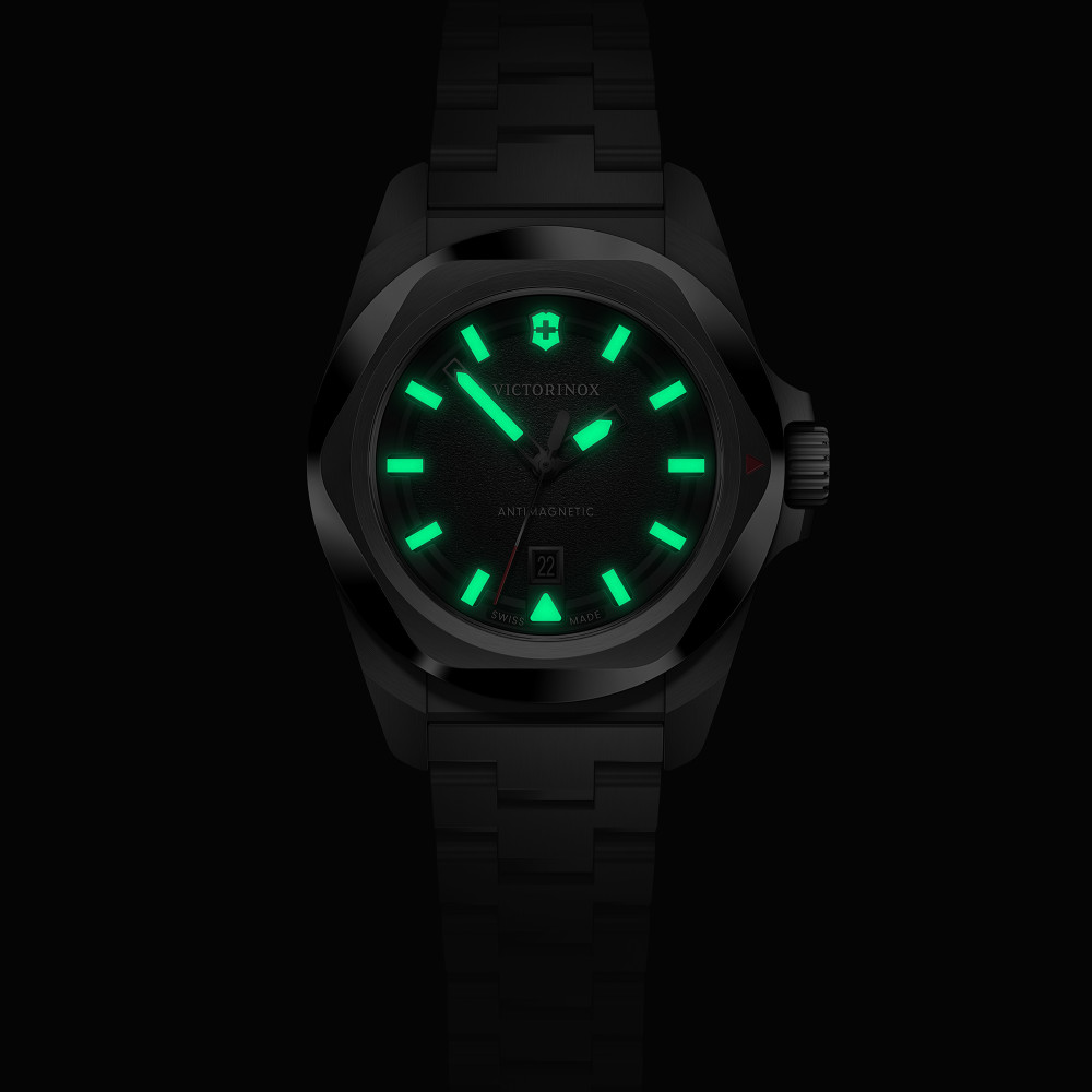 I.N.O.X. (Айнокс) - серія удароміцних і водонепроникних годинників з відмінним зухвалим дизайном безеля. Порівняно з попередніми жіночими моделями цієї серії, I.N.O.X. Small містять усі функції своїх більших аналогів: відображення дати, антимагнітний захист, удароміцність та водонепроникність. Крім того, сертифікований за ISO антимагнітний захист зберігає точність ходу годинника після щоденного впливу електромагнітного випромінювання, наприклад, від телефона або електромашини. Сьогодні годинники Victorinox проектують, виготовляють та тестують на їхньому власному заводі у Делемоні, Швейцарія.