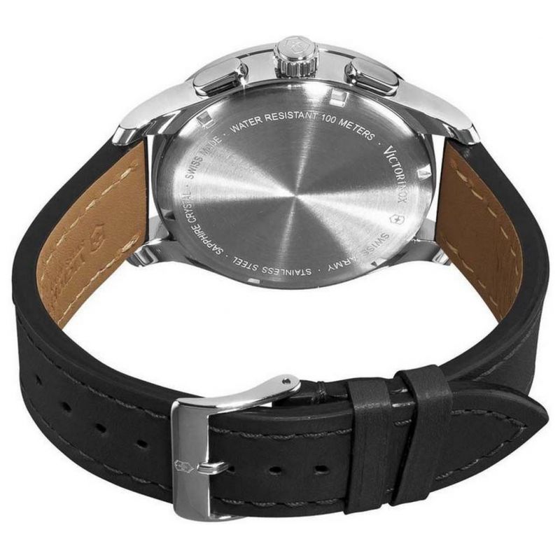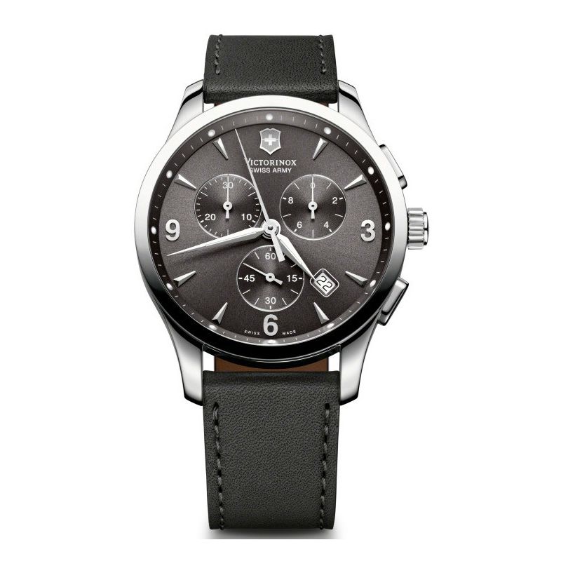 Досить стримано підійшли майстри Вікторінокс до створення циферблату: виконаний у глибокому відтінку антрацит та доповнений стильними акцентами у вигляді сріблястих полірованих стрілок, накладних арабських цифр (3, 6 та 9), а також годинних клиноподібних індексів. На обідку розмістили 60-хвилинну шкалу часу.