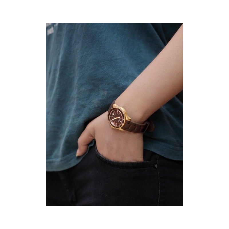 ✔ Зручний коричневий циферблат доповнений стильною золотистою індикацією, 24-годинною і 60-хвилинною шкалою часу. Для чіткої видимості в темний час доби годинна і хвилинна стрілки мають люмінесцентні вставки з зареєстрованої речовини Super-Luminova®.
