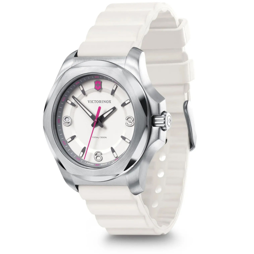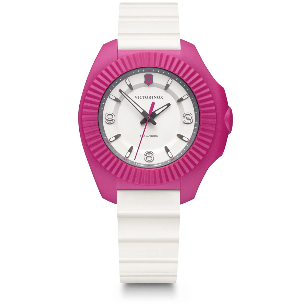 Водонепроникний та удароміцний жіночий годинник I.N.O.X. V від швейцарського годинникового бренду VICTORINOX Swiss Army. Спортивний дизайн, який поєднує одночасно зухвалість та жіночність. Екстремально міцний сталевий корпус з рожевим бампером та яскравими акцентами на циферблаті чудово гармонує з білим спортивним ремінцем.