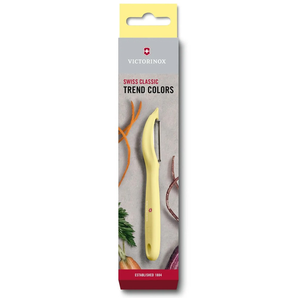 Яскрава швейцарська овочечистка Swiss Classic від Victorinox (7.6075.82; пастельно-жовта). Універсальний інструмент для чищення, який завдяки мікрозазубринам на лезі легко чистить різні фрукти та овочі як з твердою, так і м'якою шкіркою: від моркви та картоплі до томатів та ківі.