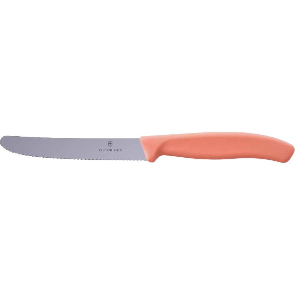 Ніж для томатів Swiss Classic з серейторним лезом 11 см та ручкою персикового кольору. Модель зі специфікацією Tomato&Table - це невеликий, але універсальний ніж, який стане незамінним помічником на кухні та за столом. Він чудово впорається не лише з нарізанням помідорів, овочів та фруктів, а й легко ріже м’які сири, зелень чи хрусткий багет. Завдяки закругленому вістрю ним зручно намазувати масло, мед або варення, що робить його практичним і у ролі столового ножа.