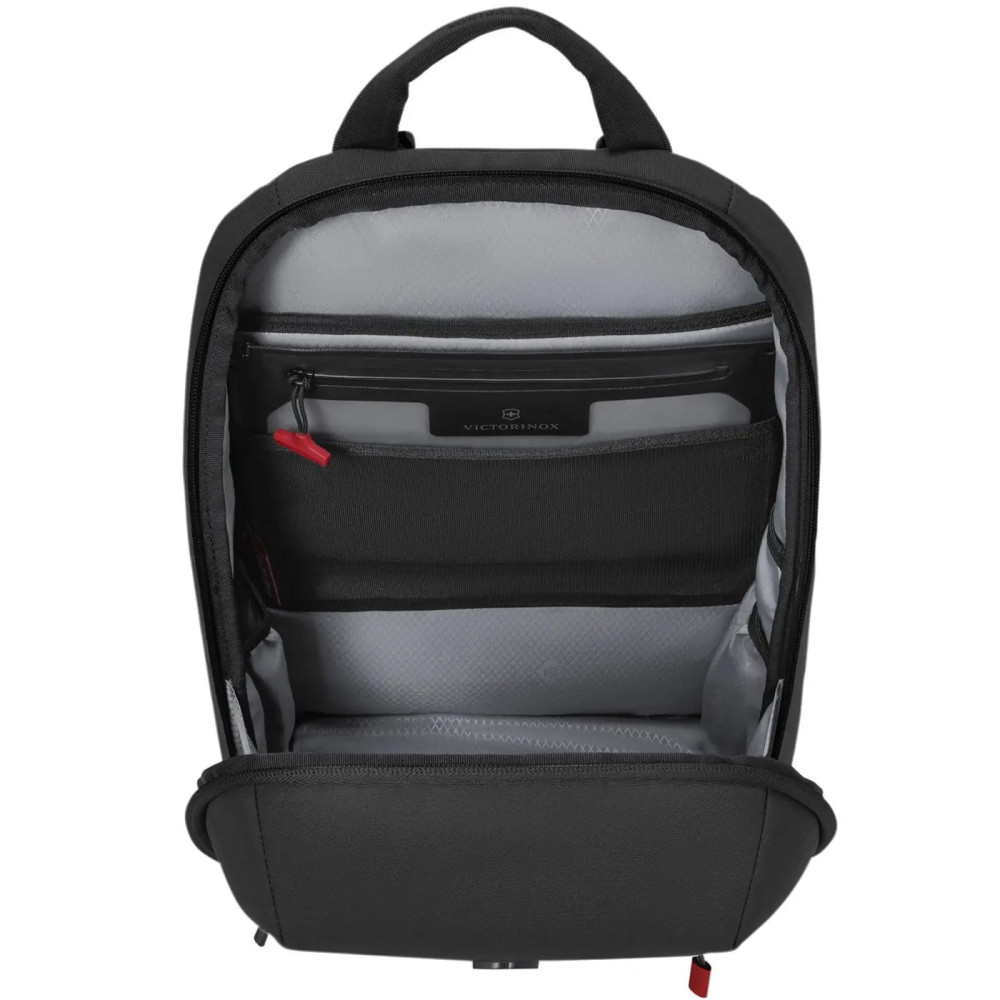 Victorinox Travel TOURING 2.0 City Daypack (чорний) – міський рюкзак на 17 л з відділенням для ноутбука 15 дюймів. Максимально простий дизайн на одне просторе відділення. Якщо ви пересуваєтеся містом велосипедом, є грудні ремінці, щоб комфортно зафіксувати рюкзак, а також кріплення для ліхтарика-маячка в нижній частині лицьової панелі (ліхтарик у комплектацію не входить).