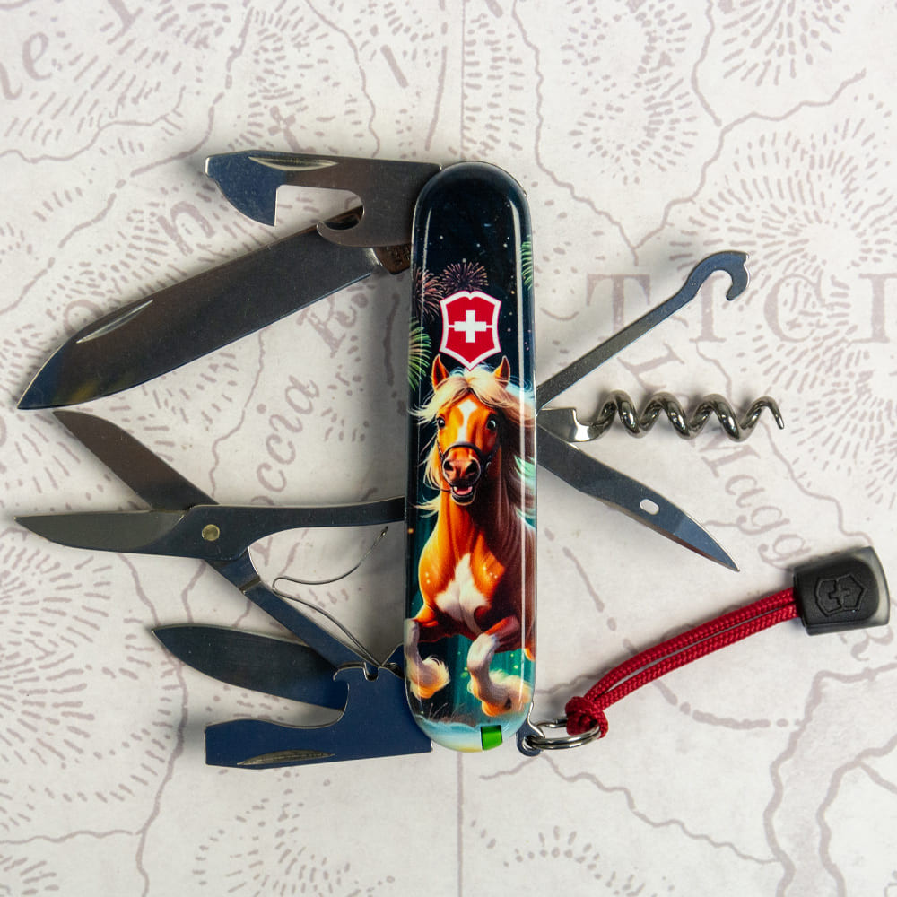 Складаний ніж CLIMBER ZODIAC 2026 [Кінь-переможець] зі спеціальної колекції, присвяченої року Коня. Популярний CLIMBER 91 мм на 14 функцій у святковому випуску доповнений шпилькою та фірмовим темляком Victorinox. Легендарна якість швейцарського армійського ножа Victorinox з кольоровим друком на обох накладках, покритим глянцевим лаком.