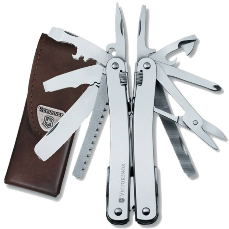Мультитул SWISS TOOL SPIRIT X 105 мм / 24 функції + коричневий шкіряний чохол / плоскогубці / ножиці / пилка / напилок / викрутки Victorinox 3.0224.L