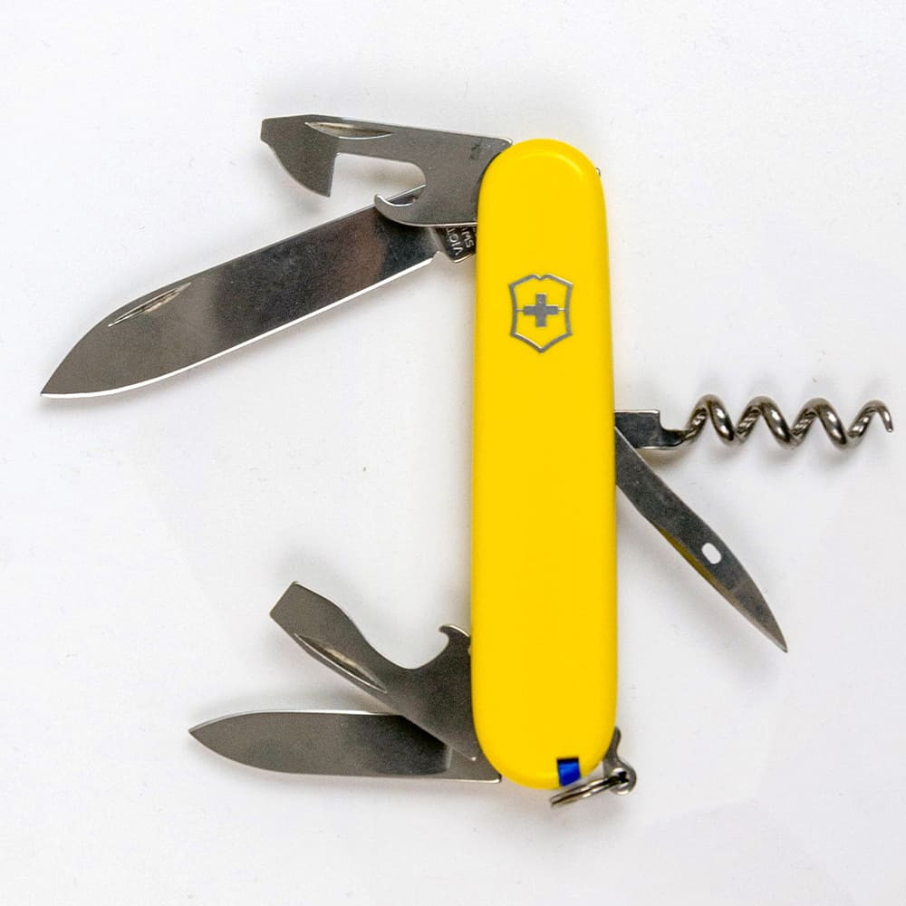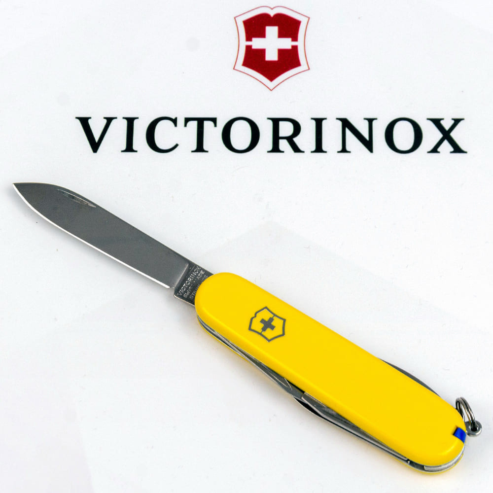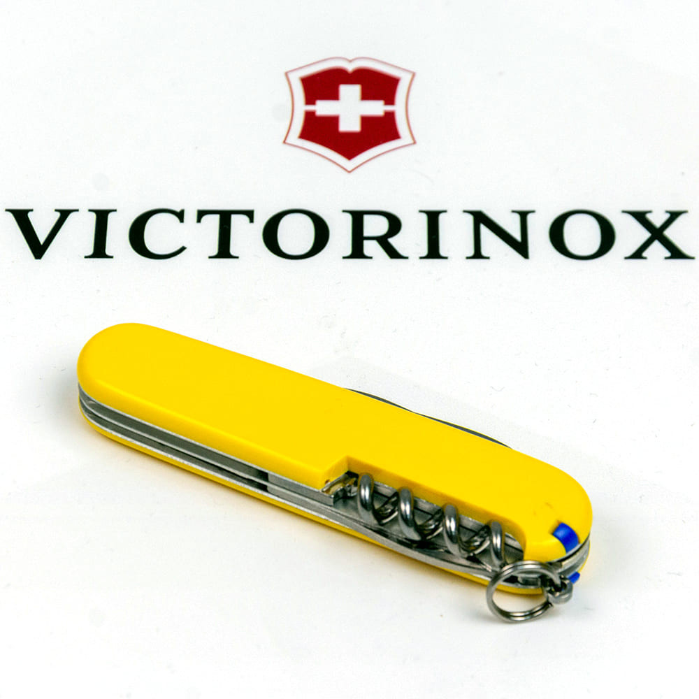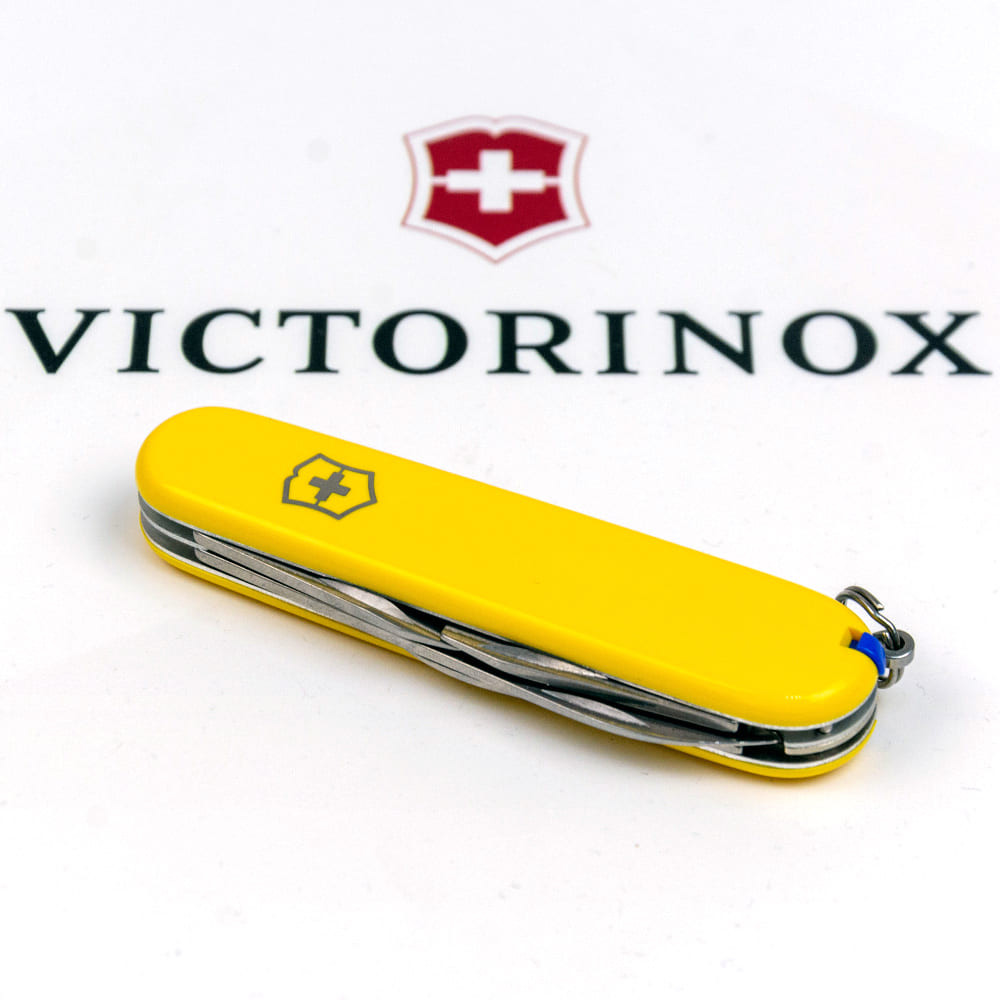 Культовий швейцарський ніж Victorinox SPARTAN у яскравому сонячному дизайні. Мультифункціональна модель із серії Spartan з 12 функціями. На лицьовій накладці – логотип бренду Victorinox.