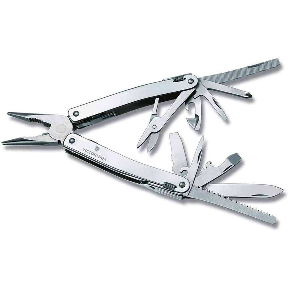1. гострогубці 2. - кусачки для тонкого дроту (до 40 HRC) 3. - кусачки для твердого дроту 4. велике лезо з блокуванням 5. пилка по дереву 6-7. пилка та напилок по металу 8. плоска викрутка 2 мм 9-10. відкривачка для консервів - плоска викрутка 3 мм 11-14. відкривачка для пляшок - плоска викрутка 6 мм - пристосування для відкривання ящиків - інструмент для згинання дроту 15. шило-кернер 16. ножиці 17. викрутка хрестова 1/2 18-20. долото 7 мм - поздовжній різак для кабелю - поперечний різак для кабелю 21. викрутка 5 мм 22. гачок 23-24. штопор + маленька викрутка 1,5 мм 25. пластиковий органайзер для біт 26-31. набір біт (викруток): Torx 10, Hex 3, Phillips 0, Hex 4, Phillips 3, Torx 15 32. ключ-подовжувач для біт 33. храповий ключ