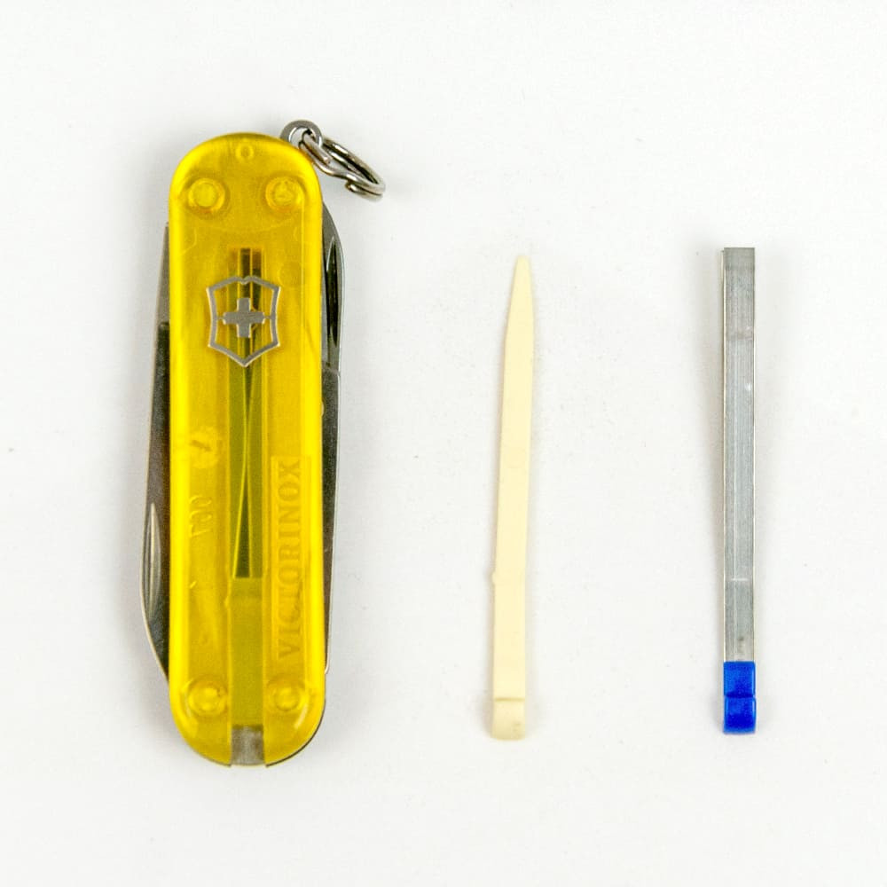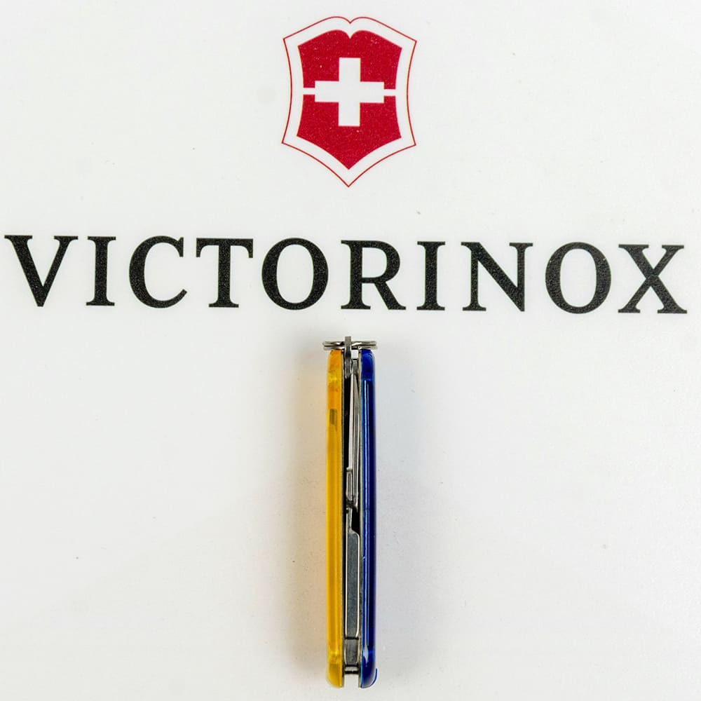 Швейцарський кишеньковий ніж Victorinox CLASSIC SD UKRAINE 58мм / 2 шари / 7 функцій / жовто-сині напівпрозорі накладки / ножиці 0.6223.T81G.T2 (Швейцарія) Гарантія: довічна